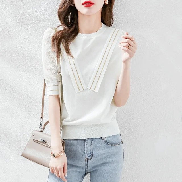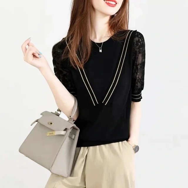 LUYE Women Round Neck Solid Lace Paneled Casual Shift Shirts & Tops